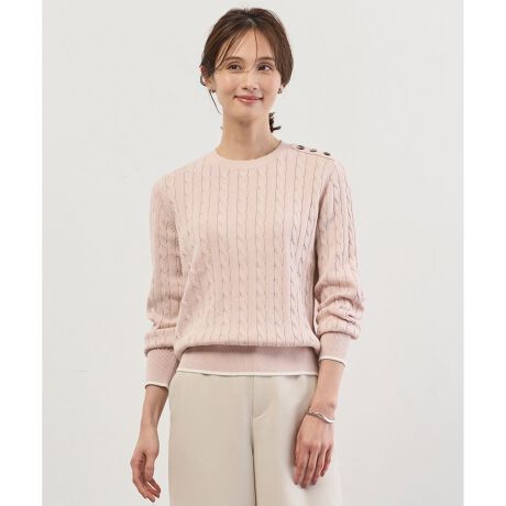 クラシックなケーブル編みが魅力のニット。今年は、糸の太さを一回り細くすることで厚みを抑えつつ、よりスマートで洗練された印象にアップデートしました。デザインのアクセントとして、肩にはポイントとなる釦を配し、さりげない配色もプラス。1枚で着映えするデザインに仕上げました。季節の変わり目に大活躍し、上品で洗練された大人のカジュアルスタイリングを楽しんでいただけるアイテムです。カラーは、柔らかく女性らしいピンク(#012)、顔周りを明るくするブラッドオレンジ(#020)、上品でやさしい印象のライトベージュ(#033)、爽やかな春色のスモーキーミント(#062)、知的でクリーンな印象のブルー(#070)の5色展開です。