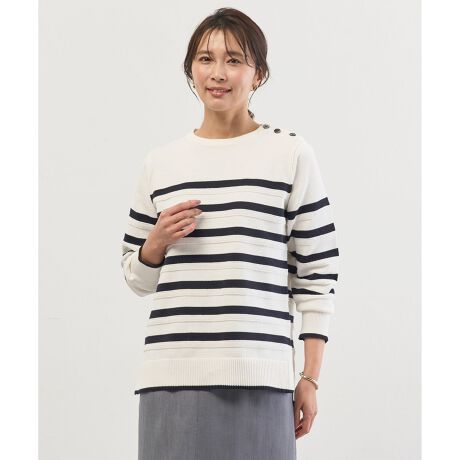 肩釦がアクセント!1枚で存在感のあるカラーボーダーニット
