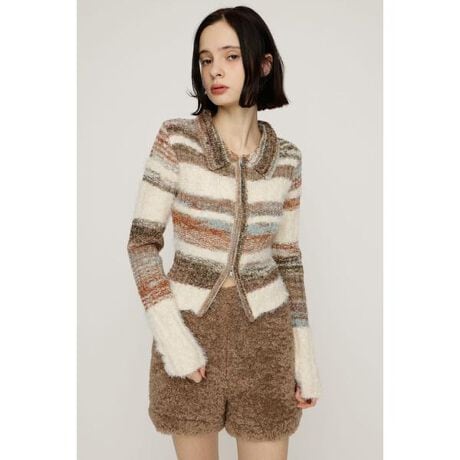 【SHAGGY MIX FRONT ZIP TOPS】■POINTミックスカラー糸とシャギー糸をランダムボーダーで仕上げた、表情豊かなジップアップニット。シャギーの表面感と、カラーごとに異なるミックス配色が魅力の1枚です。程よいショート丈でどんなボトムスともバランスが取りやすく、1枚で着映えする主役級アイテムです。■DETAIL柔らかな膨らみのあるブークレ糸と毛足のあるシャギー糸を組み合わせた表面感が魅力のニットトップス。ウール入りのニットを使用し、軽量ながらも1枚で保温性に優れたアイテムです。襟付きのジップデザインが顔まわりに程よく抜け感をプラスしてくれます。フロントはトレンドのダブルジップ仕様なので、スタイリングに合わせてジップの開き具合を調節して頂けます。■STYLING存在感のあるアイテムなので、シンプルなボトムスと合わせるのがおすすめ。ミニボトムスからデニムまで幅広いスタイリングと相性抜群です。シャギーの素材感がアウターの中でも着映えし、冬のスタイリングに華やかさをプラスします。ダブルジップは、スタイリングに合わせて上下のジップを少し開けて着用頂くのがおすすめです。■FABRIC/MATERIALブークレ糸とシャギー糸を組み合わせたウール入りのニット素材を使用。■透け感:なし■光沢感:なし■伸縮性:なし■裏 地:なし◆本品は、着用(使用)や洗濯クリーニングにより、毛羽立ちや毛玉が発生することがあります。・連続着用はお避け下さい。・毛玉が出来てしまった場合は、毛玉取り器またはハサミで丁寧にカットして取り除いて下さい。[注意事項]※画像の商品はサンプルです。実際の商品と仕様、加工が若干異なる場合があります。※画像の商品は光の照射や角度、お使いのモニター環境により、実物と色味が異なる場合がございます。※着用、お取り扱いの際は、アテンションタグをご確認ください。※一部予約商品につきましては生産上の都合によりお届け予定日や店頭発売と前後する場合もございます。※追加生産商品は、一部の店舗、通販で販売中の場合がございます。予めご了承下さい。