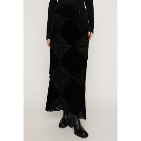 【VELOUR L/SK】■POINT異素材のコントラストを活かしたSLYオリジナル柄デザインが目を惹くロングスカート。ベロア素材と繊細なレースを組み合わせ、女性らしさの中に程よいエッジを加えました。ウエストは総ゴム仕様でリラックス感がありながら、身体のラインを拾わないシルエットがスタイルアップを叶えます。1枚で秋冬のスタイリングを格上げしてくれるアイテムです。■DETAIL伸縮性のあるベロア素材とストレッチレースを使用し、快適なフィット感とストレスフリーな穿き心地が魅力です。裾はメロウ始末で仕上げ、動きに合わせて柔らかく揺れるシルエットが女性らしさを引き立てます。裏地付きで透け感を気にせず安心して着用して頂けます。幅広いスタイリングに馴染むオフホワイトとブラックの2色展開です。■STYLING毛足のあるシャギーニットやオフショルダーニットと合わせた上品な着こなしがおすすめです。存在感のあるレザーアウターやファーアウターを羽織ったスタイリングが一押し。足元は厚底ブーツなどで合わせると全体が引き締まりバランスの取れたスタイリングに仕上がります。■FABRIC/MATERIAL伸縮性のあるポリエステルベロア素材とレーヨンポリエステルのストレッチレース素材を使用。■透け感:なし■光沢感:あり■伸縮性:あり■裏 地:あり●本品は素材の特性上色落ちします。洗濯、クリーニング、着用(使用)時に他の衣類や雑貨、家具類に色移りする事があります。特に汗や雨等で湿った状態では、色落ちが顕著になります。白、淡色との組み合わせは避け、お取り扱いには十分ご注意下さい。●本品には毛羽や毛足のある素材を使用しております。ご使用中に加わる摩擦や磨耗によって多少の毛羽抜けや毛羽乱れが生じる事があります。素材特性上完全に防ぐ事ができませんのでご了承下さい。抜けた毛羽が他の物に付着する事があります。その際はエチケットブラシ・粘着テープ等で取り除いて下さい。濃色は毛羽の付着が目立ちますので、できるだけ同系色のものとの組み合わせをおすすめいたします。●素材の特性上、ハンギングにより商品の丈が伸びてしまう可能性があります。その為、保管方法はたたみをおすすめします。[注意事項]※画像の商品はサンプルです。実際の商品と仕様、加工が若干異なる場合があります。※画像の商品は光の照