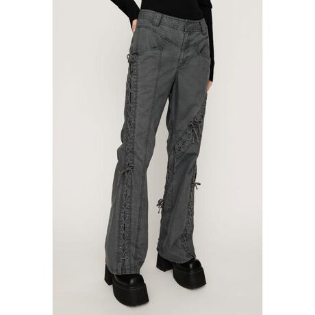【LACE UP MANNISH PT】■POINTアシンメトリーに施されたレースアップデザインが目を惹くパンツ。カジュアルなワークテイストの中に女性らしいアクセントをプラスしたSLYらしいデザインパンツです。程よく広がるフレアシルエットが脚のラインを拾いすぎず、自然にスタイルアップを叶えます。■DETAIL全体にバイオ加工とストーンウォッシュ加工を施し、ヴィンテージライクな風合いに仕上げています。レースアップにはハトメデザインでエッジを効かせているのもポイントです。トレンドのやや浅めのローウエストが今季らしい旬なスタイリングを楽しめます。■STYLINGロゴニットや毛足のあるシャギーニットと合わせるとシーズンムード高めるスタイリングに。ガーリーなレーススカートなどを腰に巻いたレイヤードスタイルも一押しです。足元は厚底のブーツを合わせることでよりスタイルアップが叶い、全体をすっきりとまとめてくれます。■FABRIC/MATERIALロングシーズンで着用して頂ける程よい厚みのコットンツイル素材を使用。■透け感:なし■光沢感:なし■伸縮性:なし■裏 地:なし●本品は顔料を使用しています。素材特性上、着用やクリーニングを繰り返すにつれ徐々に白化や顔料の脱落が生じ、独特な色合いをお楽しみいただけます。濃色品は、摩擦により他の衣料、雑貨、家具類に色落ちします。白、淡色との組み合わせは避けて下さい。また製品で特殊な洗い加工を施している為、商品の仕上がりに個体差が生じます。1点1点、違う表情をお楽しみください。[注意事項]※画像の商品はサンプルです。実際の商品と仕様、加工が若干異なる場合があります。※画像の商品は光の照射や角度、お使いのモニター環境により、実物と色味が異なる場合がございます。※着用、お取り扱いの際は、アテンションタグをご確認ください。※一部予約商品につきましては生産上の都合によりお届け予定日や店頭発売と前後する場合もございます。※追加生産商品は、一部の店舗、通販で販売中の場合がございます。予めご了承下さい。