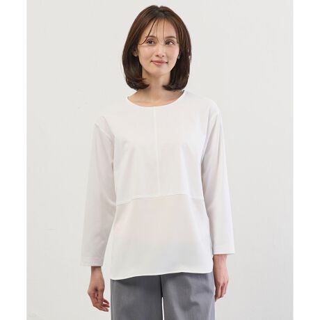 裾にマットなサテン生地で切り替えを施し、上品な印象に仕上げたカットソー。程よく透け感のあるサテン生地の裾にしているので、カジュアルになりすぎずきれいめな印象に。襟ぐりは裏バインダー仕様のブラウスのようなディテールを取り入れ、首元をすっきりと見せます。ニットやカーディガンを重ねてバランスよく決まる、着回し力の高いアイテムです。「通常のTシャツやインナーでは物足りない」「カジュアルすぎる」と感じる方におすすめしたい1着です。