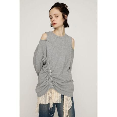 【OPEN SHOULDER SW TOPS】■POINT前回ご好評頂いたスウェットトップスが再登場。左右アシンメトリーに開いたオープンショルダーデザインが、程よい肌見せを叶えるスウェットトップスです。フロントのドローストリングでギャザー分量を調整でき、気分やスタイリングに合わせてシルエットを変えられる表情豊かな1枚です。■DETAIL肩から腕まわりは程よい開き具合で、ヘルシーな肌見せをしながらも気になる部分はしっかりカバーするデザインです。程よくゆったりとしたサイズ感ながらも女性らしい印象を演出します。ドローストリングは調整可能なのでお好みの丈感で着用して頂けます。■STYLINGデニム合わせはもちろん、ミニボトムスとロングブーツでカジュアルガーリーなスタイリングも今季一押しです。ギャザーを寄せずに着用する時は、ロングスカート合わせがおすすめです。オーバーサイズシルエットなので中にニットなどを着用でき、こなれ感のでるレイヤードスタイリングが完成します。■FABRIC/MATERIAL程よい厚みの裏毛素材を使用しています。■透け感:なし■光沢感:なし■伸縮性:なし■裏 地:なし本品は裁ち切り始末にしています。着用や洗濯、クリーニングの繰り返しにより、ほつれが増したり、裁ち切り部分が丸まってくる事がありますので、ご了承下さい。ほつれが目立った際はほつれた糸を引っ張ったりせず、カットして下さい。本品は素材の特性上色落ちします。洗濯、クリーニング、着用(使用)時に他の衣類や雑貨、家具類に色移りする事があります。特に汗や雨等で湿った状態では、色落ちが顕著になります。白、淡色との組み合わせは避け、お取り扱いには十分ご注意下さい。[注意事項]※画像の商品はサンプルです。実際の商品と仕様、加工が若干異なる場合があります。※画像の商品は光の照射や角度、お使いのモニター環境により、実物と色味が異なる場合がございます。※着用、お取り扱いの際は、アテンションタグをご確認ください。※一部予約商品につきましては生産上の都合によりお届け予定日や店頭発売と前後する場合もございます。※追加生産商品は、一部の店舗、通販で販売中の場合がございます。予めご了承下さい。