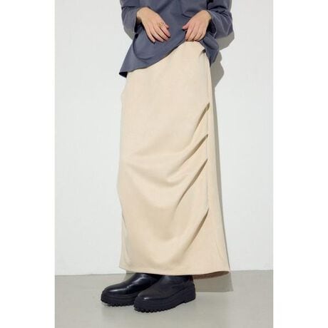■フェイクスエードタックスカート■ポイントスエードタッチの柔らかな艶と、前身頃に流れるドレープが大人の雰囲気を演出するロングスカート。■ディテールしなやかなスエード調素材が落ち感を生み、縦ラインを強調してすっきり見え。フロントに寄せたドレープが気になる腰まわりをふんわりカバーし、動くたび表情豊かに揺れます。後ろウエストはゴム仕様でラクな穿き心地です。足さばきの良いロング丈で、秋冬のニットとも好相性。■スタイリングタイトなニットをインしてキレイめにまとめるのはもちろん、オーバーサイズなスウェットとも相性◎。■生地柔らかな肌触りの良いスエード素材を使用。透け感:なし裏 地:なし伸縮性:あり光沢感:ややあり[注意事項]※画像の商品はサンプルです。実際の商品と仕様、加工が若干異なる場合があります。※画像の商品は光の照射や角度、お使いのモニター環境により、実物と色味が異なる場合がございます。※着用、お取り扱いの際は、アテンションタグをご確認ください。