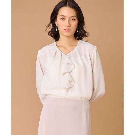 ■デザイン衿ぐりにタックを入れた、華やかなラッフルフリルがポイントのブラウス。すっきりとしたシルエットにVネックのデザインバランスが、大人の抜け感漂うアイテムです。ウエストインした時にフリルがウエストにかからず存在感がありつつもすっきりとした見え感にしています。メイントップスとしてはもちろん、ジャケットのインにも映えるロングシーズン着回しの効くブラウスです。■素材上品な印象の梨地ジョーゼット。年間を通してシーズンレスで着用できる素材です。ポリエステル素材なのでシワにもなりにくいです。・水洗い可・後ろボタンあり■サンプル撮影商品画像の商品はサンプルです。実際の商品とはサイズや色味、素材、デザイン等の仕様が若干変更になる場合がございます。■照明の関係により、実際の製品とは色味が違って見える場合があります。またパソコン・スマートフォンなどの環境により、若干製品と画像のカラーが異なる場合もございます。■サイズ表記はあくまで目安となります。