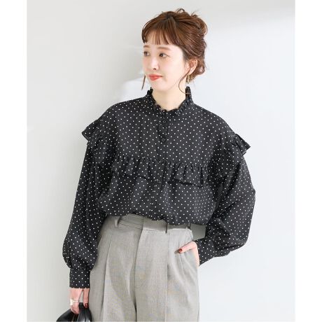ドット柄2色と無地は表面感がある素材感を使用しています。スタンドカラーのフリルが顔周りを華やかに見せてくれ、程よくデザイン性がありながらも、スッキリとしたサイズ感でオンオフ問わず活躍できるアイテムです。