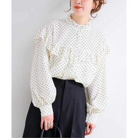 ドット柄2色と無地は表面感がある素材感を使用しています。スタンドカラーのフリルが顔周りを華やかに見せてくれ、程よくデザイン性がありながらも、スッキリとしたサイズ感でオンオフ問わず活躍できるアイテムです。