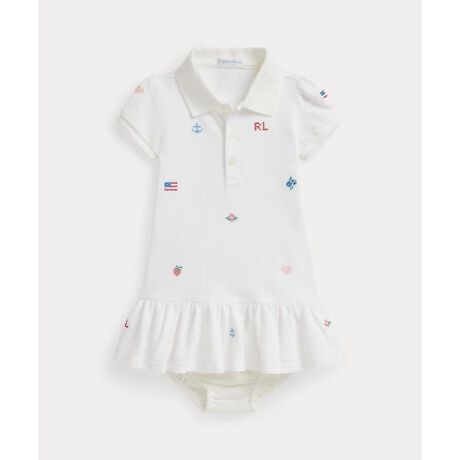 クロスステッチのアンカー、星条旗、花の愛らしいモチーフがニューイングランドの夏を思わせるメッシュのポロドレス。・ドロップウエストのシルエット・リブのポロカラー / 3つボタンの前立て / 特別に開発したRalph Laurenのロゴ入りボタン・半袖のパフスリーブ、リブアームバンド / 全体にRL、星条旗、花、アンカー、ストロベリー、ハートのクロスステッチ・ヒダの入った裾・お揃いのブルマー付き※商品の色味は、光のあたり具合など諸条件により色感が多少異なって見える場合がございますので予めご了承下さい。※注意:柄の配置は、商品によって異なります。 【素材】・上 本体:綿 100% 装飾部分:ポリエステル 100% パンツ 本体:綿 100%【生産国】カンボジア