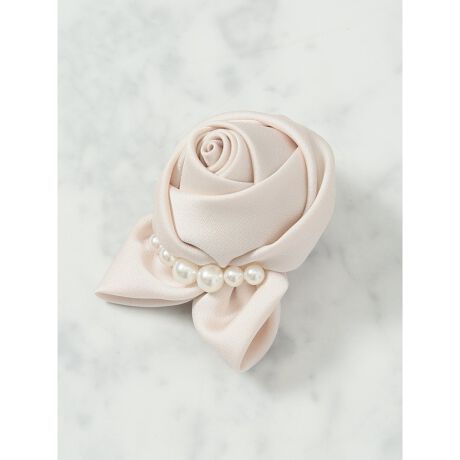 ■セレモニーやオケージョンなど、ハレの日のフォーマルシーンに欠かせないコサージュです。上品な光沢のあるサテン素材を使用。立体感のあるバラをイメージしたコサージュに、人工パールとビジューをあしらって華やかな雰囲気に仕上げています。ジャケットやワンピースに添えると、胸元の上品なアクセントとして大活躍してくれます。留め具はクリップと安全ピンがついています。