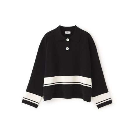 ボクシーなシルエットのニットプルオーバー。太幅のボーダーデザインと大きめなボタンがデザインポイント。
