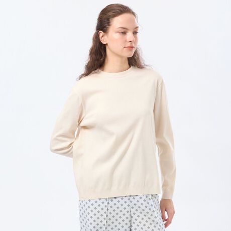 ハイゲージの上品さと軽快さを兼ね備えたクルーネックプルオーバー。セーターマシーンで仕上げている為、袖口や裾のリブ部分から身頃に向かって編み続きで違う組織に変化しながら編み上げることができ、リブ部分は継ぎ目も無くすっきりとフラットに仕上がっており、シンプルながら拘りの詰まったニットプルオーバーです。カジュアルなアイテムとコーディネートしても上品で大人な雰囲気にまとまります。