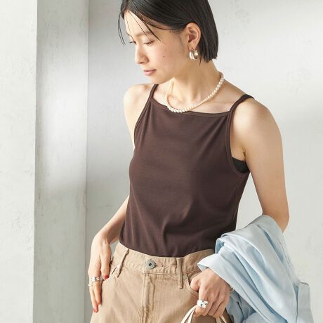 あえて首もとは詰まったデザインにしており、シャツやジャケットのインナーとしてはもちろん、一枚着で着ていただいても決まりの良いキャミソール型。