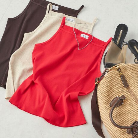 あえて首もとは詰まったデザインにしており、シャツやジャケットのインナーとしてはもちろん、一枚着で着ていただいても決まりの良いキャミソール型。