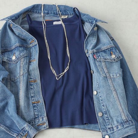 あえて首もとは詰まったデザインにしており、シャツやジャケットのインナーとしてはもちろん、一枚着で着ていただいても決まりの良いキャミソール型。