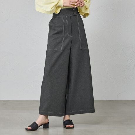 デニム調の素材を使用したワイドストレートシルエットパンツ。パッチポケットと配色ボタンがポイントで、大人が履けるデザインパンツに仕上げました。素材が程良く落ちるので、きれいなシルエットが特徴です。