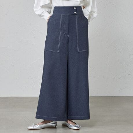 デニム調の素材を使用したワイドストレートシルエットパンツ。パッチポケットと配色ボタンがポイントで、大人が履けるデザインパンツに仕上げました。素材が程良く落ちるので、きれいなシルエットが特徴です。