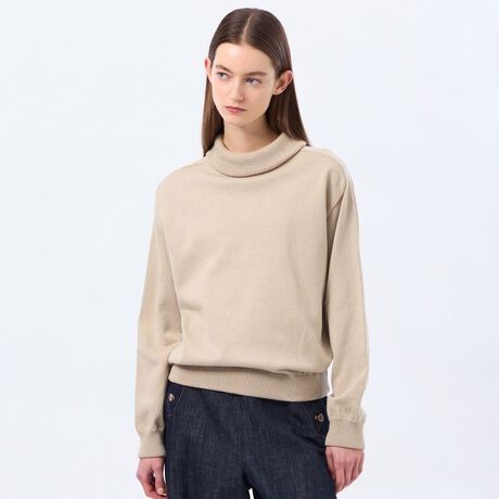 襟、袖口、裾の裏側にバイカラーを施した、エポーレットスリーブのニットプルオーバー。