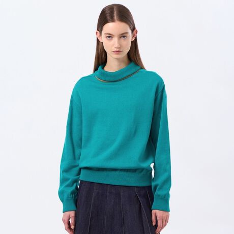 襟、袖口、裾の裏側にバイカラーを施した、エポーレットスリーブのニットプルオーバー。
