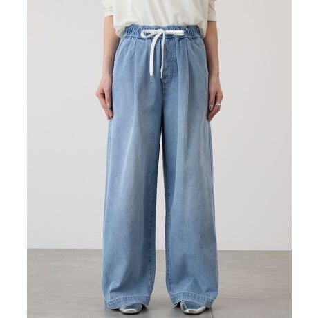 AMERICAN HOLIC DENIM COLLECTION程よいボリューム感のワイドシルエットがどんなトップスにもトレンド感をプラスするイージーデニムパンツ。総ゴム+紐ウエストでリラックスした穿き心地と着脱のしやすさを両立。ヒップにゆとりを持たせ、足のラインを拾わない設計で自然に体型カバーが叶う一着です。フロントのタックが立体感を生み、きれいめアイテムの外しとして合わせるのもおすすめです。※モデル着用画像は、光の当たり具合で色味が違って見える場合がございます。※お使いのモニター環境によって商品の色味が違って見える場合がございます。