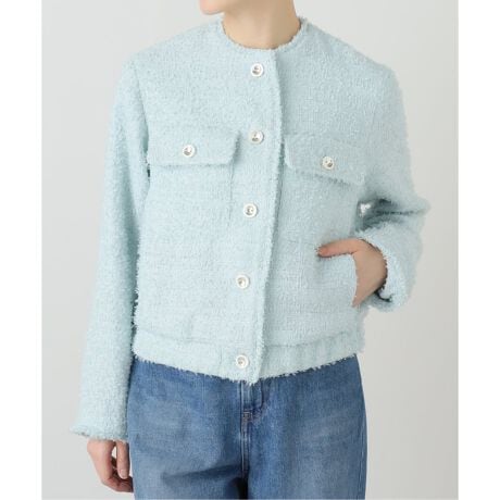 今年注目のペールブルーを差し色に取り入れ、ブルゾンのような軽やかさに仕上げたツイードジャケット。