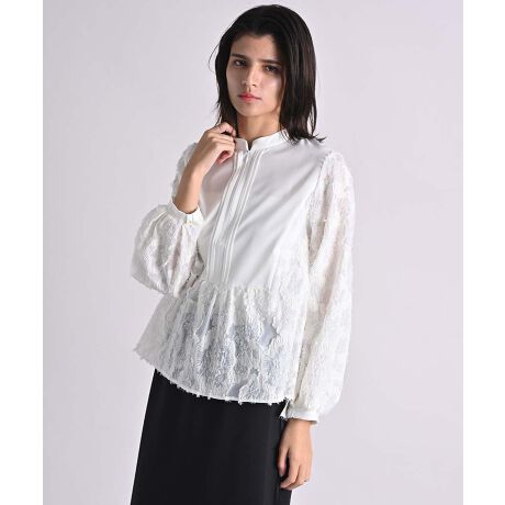 立体感のあるカットジャガード生地と、すっきりとした無地生地を切り替えたデザインブラウス。