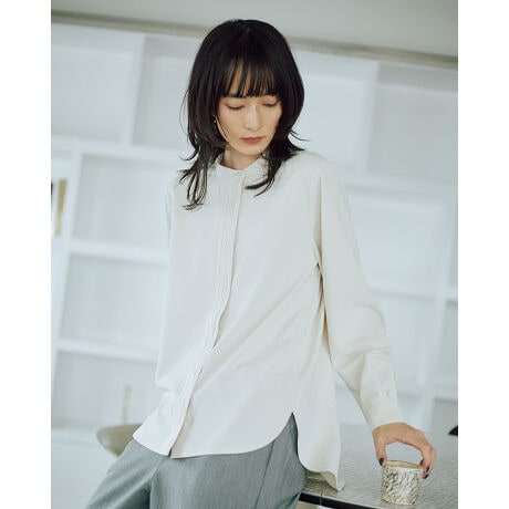 落ち感のある、ジョーゼット素材を使用したバンドカラーシャツです。