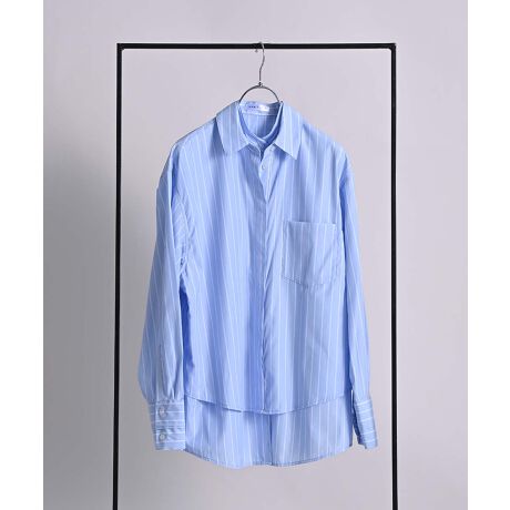 シャツを2枚重ねたようなレイヤードデザインが目を引くストライプシャツ。