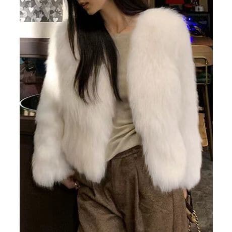 ボリューム感たっぷりのフェイクファーを使用した、ノーカラージャケット。