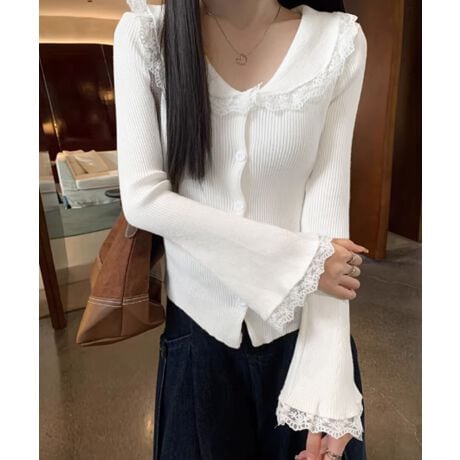 繊細なレース使いが目を惹く、フェミニンムードたっぷりのリブニットトップス。