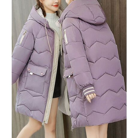 冬のスタイリングに取り入れたい、ミディアム丈のフード付き中綿フェイクダウンコート。