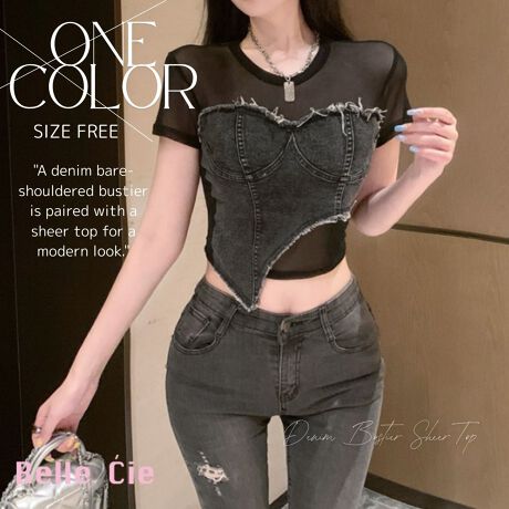 -デニムのベアトップビスチェがシアートップスにドッキングされていて