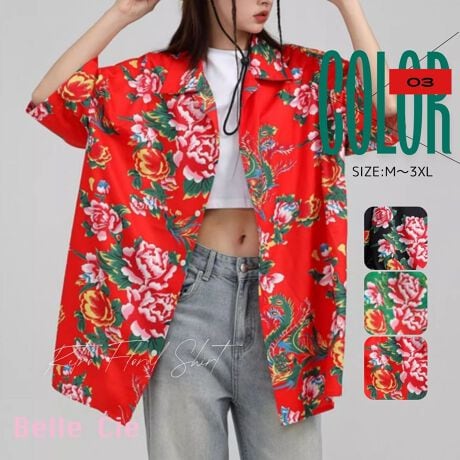 -インパクトのあるレトロ花総柄の半袖シャツ