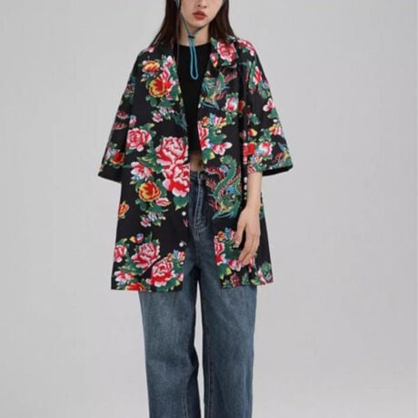 -インパクトのあるレトロ花総柄の半袖シャツ