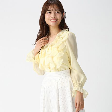 ふんわりとした胸元のフリルが華やかなムードを放つブラウス。袖口はシャーリングの切り替えを施しており、フィット感のある着心地を演出します。ほんのりと透け感のある薄手の生地がポイント。スカートはもちろんデニムと合わせた着こなしもおすすめです。■fabric透け感[有り]裏地[無し]伸縮性[無し]生地の厚さ[薄手]