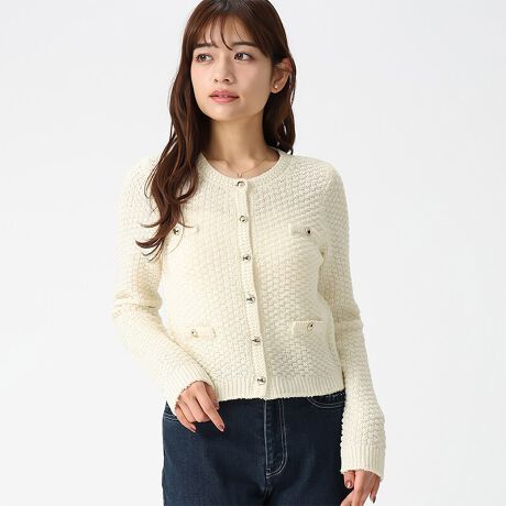 凹凸感のある格子編みで仕立てられたニットジャケット。ベーシックなクルーネックのデザインが上品な印象を与えます。ブラウスとのレイヤードや、トップス風の着こなしもおすすめ。季節の変わり目のお出かけスタイルに重宝したいアイテムです。■fabric透け感[やや有り]裏地[無し]伸縮性[有り]生地の厚さ[普通]