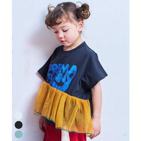 インパクトのあるロゴプリントに、ウエスト部分のチュールフリルを合わせたデザインTシャツです。