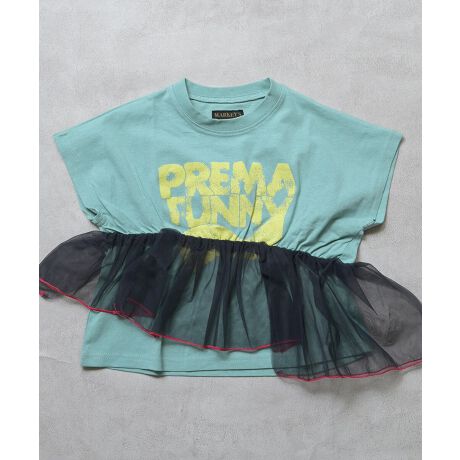 インパクトのあるロゴプリントに、ウエスト部分のチュールフリルを合わせたデザインTシャツです。