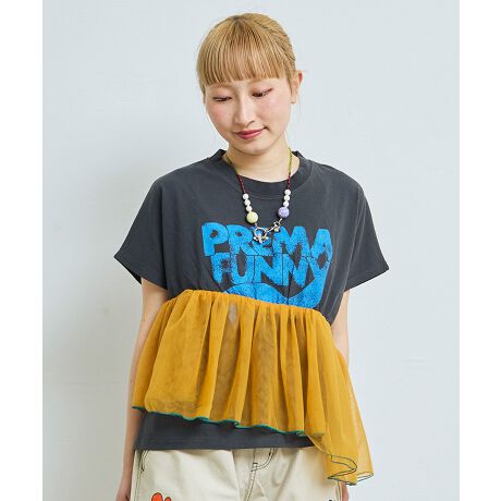 インパクトのあるロゴプリントに、ウエスト部分のチュールフリルを合わせたデザインTシャツです。