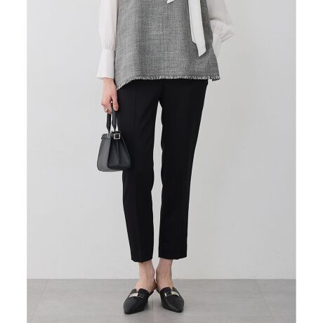 ■デザインウエストがゴム仕様でストレス無く履いていただけるパンツです。ベルトの内側はドロスト仕様になっており、シルエットはキレイ目なスティック型に仕上げました。シンプルなデザインで単品使いはもちろん、同シリーズのブラウスとのセットアップ着用もおすすめです。