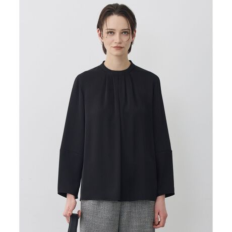 ■デザイン襟のタック、袖口に切り替えの入ったランタンスリーブがポイントのブラウスです。体のラインを拾いにくいAラインのシルエットで、細身のパンツからワイドパンツまで、様々なボトムと合わせやすいデザインに仕上げました。単品使いはもちろん、同シリーズのパンツとのセットアップ着用もおすすめで、通勤やきれいめスタイルに活躍する一枚です。