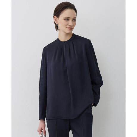 ■デザイン襟のタック、袖口に切り替えの入ったランタンスリーブがポイントのブラウスです。体のラインを拾いにくいAラインのシルエットで、細身のパンツからワイドパンツまで、様々なボトムと合わせやすいデザインに仕上げました。単品使いはもちろん、同シリーズのパンツとのセットアップ着用もおすすめで、通勤やきれいめスタイルに活躍する一枚です。