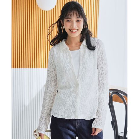 ・ストレッチ性のある繊細なトレンドのレース生地を使用したシャツ・羽織としてもトップスとしても着用可能・前後差のある丈が腰周りを自然にカバー・パンツ、スカートどちらにも合わせやすいバランスに仕上げています