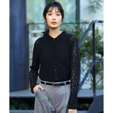 ・ストレッチ性のある繊細なトレンドのレース生地を使用したシャツ・羽織としてもトップスとしても着用可能・前後差のある丈が腰周りを自然にカバー・パンツ、スカートどちらにも合わせやすいバランスに仕上げています