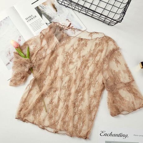 -シアー素材のトレンド感溢れる花柄レーストップス