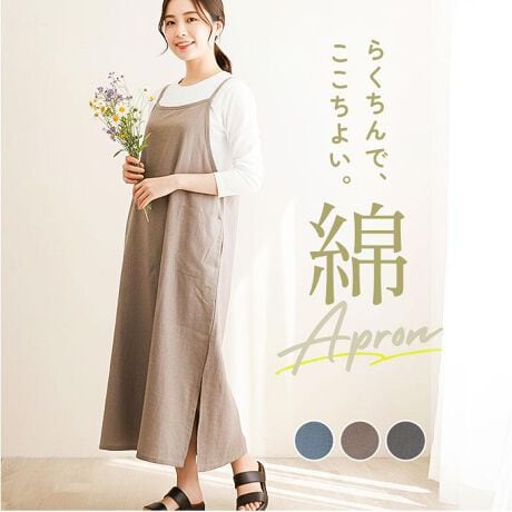 【ワンピースのようなエプロン】すっぽり被るだけ、ボタンレスで楽ちん。ワンピースのような、両脇スリットエプロン。【すっぽり被るだけ簡単】ボタンや紐がないかぶるタイプで、忙しい朝も着脱がスムーズな手軽さ♪【おしりまでカバー】ロング丈で気になるヒップラインをしっかり隠せる安心設計◎【両脇スリットで動きやすい】サイドにスリットがあるから、座る時も歩く時もストレスフリーな快適仕様!【ワンピース風デザイン】服のような見た目でおしゃれに着こなせる、ちょっとそこまでお出かけできるデザイン。【インド綿の心地よさ】綿100%のインド綿を使用し、肌触りが優しく毎日着たくなる。