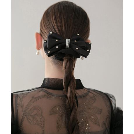 思わず目を惹くシックなブラックのリボンに、きらめくビジューを贅沢に散りばめた、圧倒的な存在感を放つラグジュアリーなシュシュ
