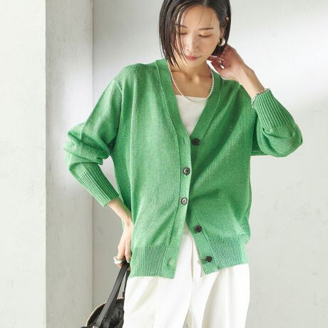 盛夏まで長く着られるペーパーアセテート素材のニットカーディガン