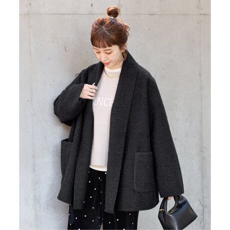ジャージタイプのブークレー素材を使用した、さっと羽織りやすい着流しコートです。裏地のないシンプルな仕立て、ヒップが隠れるミドル丈でお作りし、季節の変わり目や軽めのアウターが欲しいときにぴったりの一枚となっています。付属のキルトピンで前を留めても着用いただけます。ドライクリーニングにてお手入れ可能です。