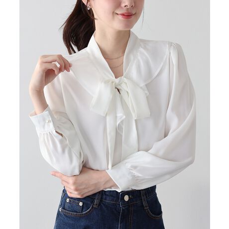 顔周りを華やかに彩るラッフルフリルと、クラシカルなボウタイを組み合わせた着映えブラウス。