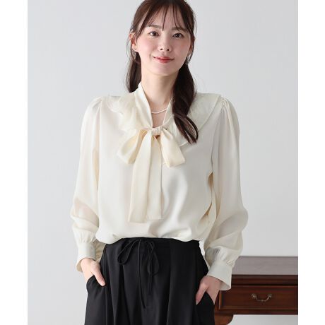 顔周りを華やかに彩るラッフルフリルと、クラシカルなボウタイを組み合わせた着映えブラウス。